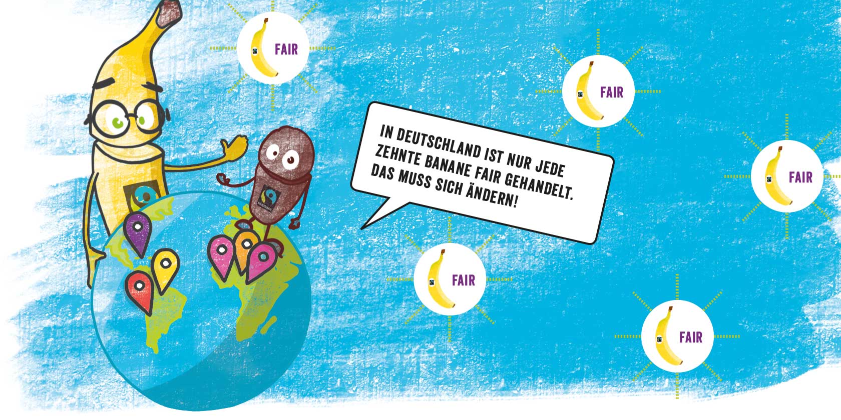 Fairtrade-Bananen sind eine gute Sache, für die jeder die Werbetrommel rühren sollte. Wir als Kommunikationsexperten rühren da gerne professionell mit. Gesucht war eine Schulaktion zum Banana Fairday 2018 samt allen dafür benötigten Werbe- und Informationsmaterialien. Mit im Bananaboot saß mit Felix van der Laden alias Spielkind ein bekannter YouTuber. Er meldete sich während des Aktionszeitraums per Live-Video von einer kolumbianischen Fairtrade-Plantage und dankte den Schülern persönlich für ihre Unterstützung. In Sachen Glam Factor natürlich nahezu unschlagbar. Muss sogar das von uns entwickelte Testimonial Naane Banane zugeben.