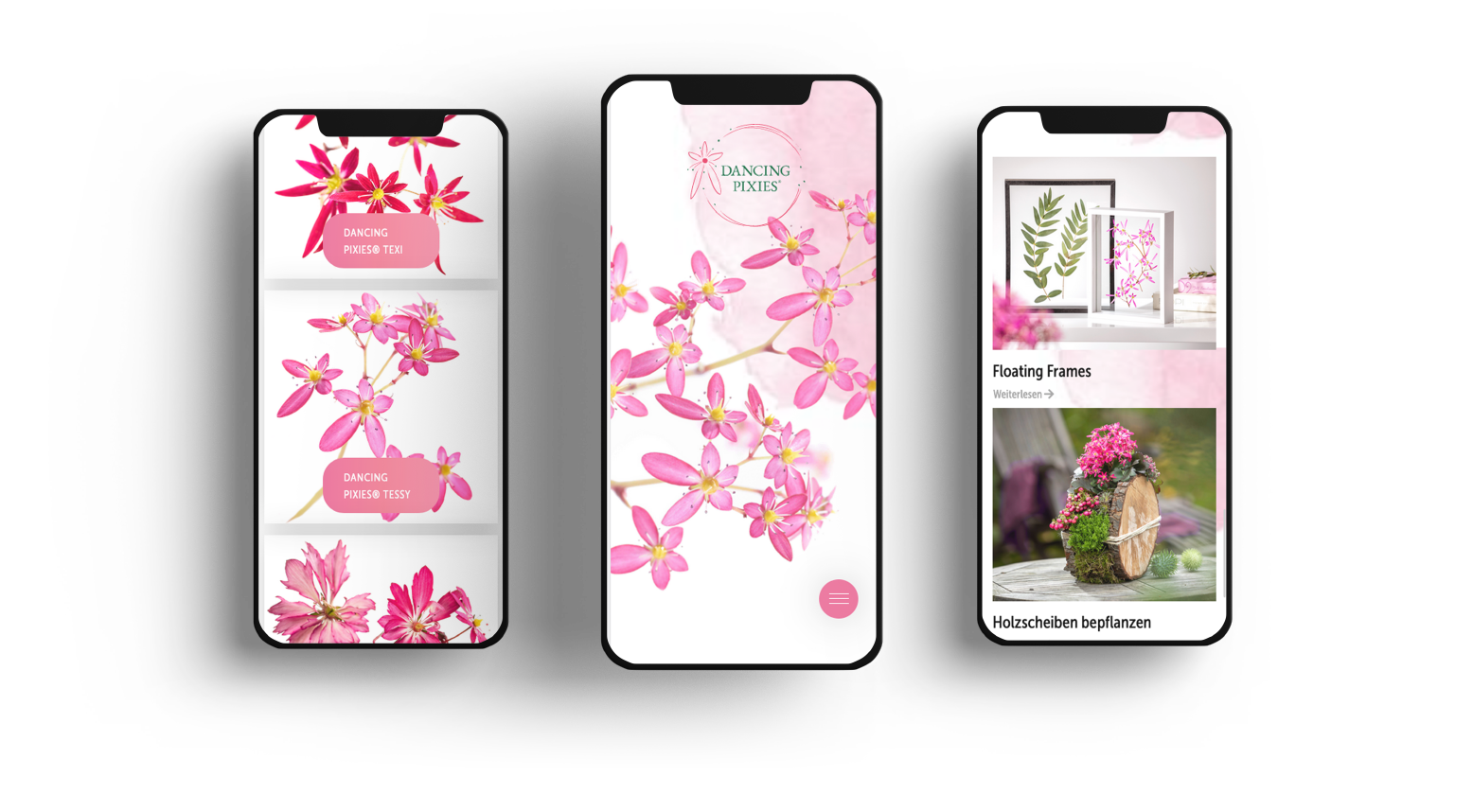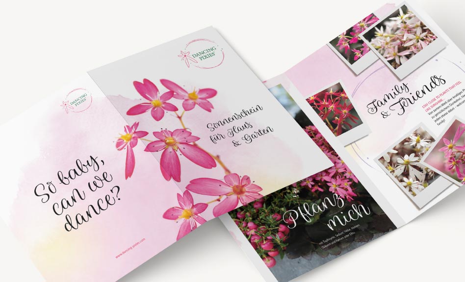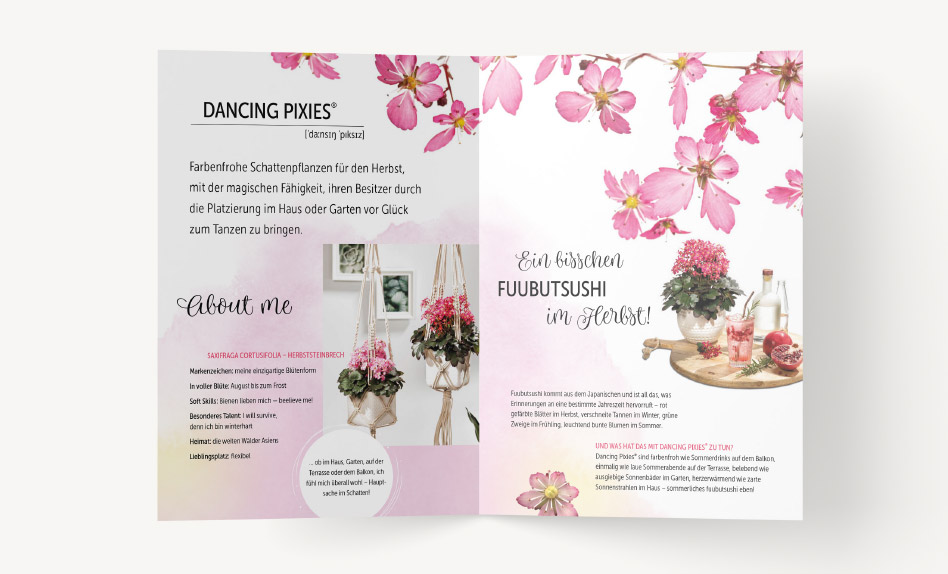 Für seine eigene neue Züchtung der Gattung Saxifraga (zu deutsch: Herbststeinbrech) benötigte der Kunde zunächst einmal Name und Logo. Wie wir auf Dancing Pixies gekommen sind, erklärt sich beim Anblick der Blüte von selbst. Wer da keine tanzenden Elfen sieht, der ist entweder komplett unromantisch oder schlichtweg nicht im psychodelischen Zustand unseres Texters nach der Recherche tausender bereits existierender Blumennamen. Der war dann auch gar nicht sooooo böse, dass der Kunde die Texte für Website und Broschüre selbst lieferte. Die Gestaltung kam aber durchgehend von uns.