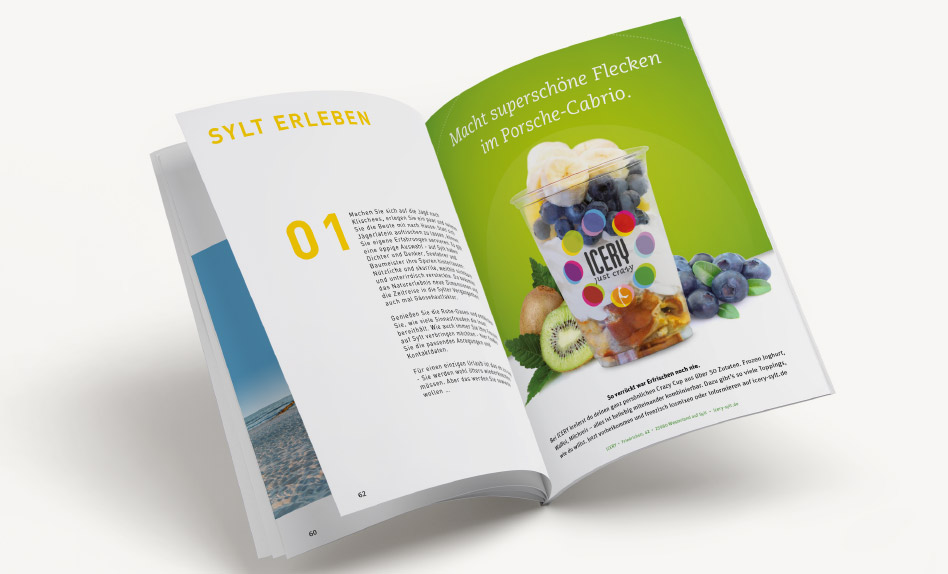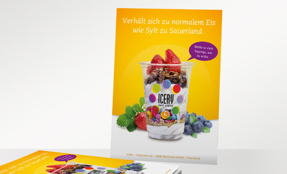 In den Mittelpunkt unserer Kommunikation rückten wir das Produkt selbst. Es schmeckt schließlich nicht nur gut, sondern sieht auch noch gut aus. Außer um Anzeigen und Flyer kümmerten wir uns bei ICERY um die Präsentation vor Ort. Unter anderem haben wir die Produkttafel im Café gestaltet.
