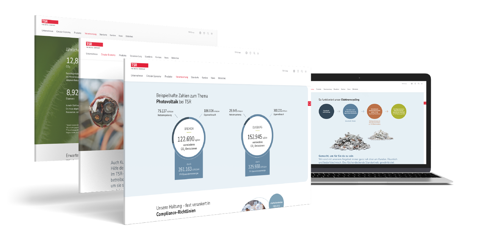 Bei TSR hat der ganz große Wandel eingesetzt. Weg vom klassischen Metallverwerter, hin zum Produzenten hochwertiger Rohstoffe. Und wo so viel neu ist, darf auch eine neue Website nicht fehlen. Kernbotschaft: TSR ist mit seinen Qualitätsprodukten der perfekt nachhaltige Partner für die Industrie. Passend zur neuen Rolle und zum neuen Selbstverständnis kommt der Website-Relaunch in cleanem Design und mit ganz viel Mehrwertkommunikation daher. Unter anderem für anspruchsvolle Zielgruppen wie die Automobilbranche.