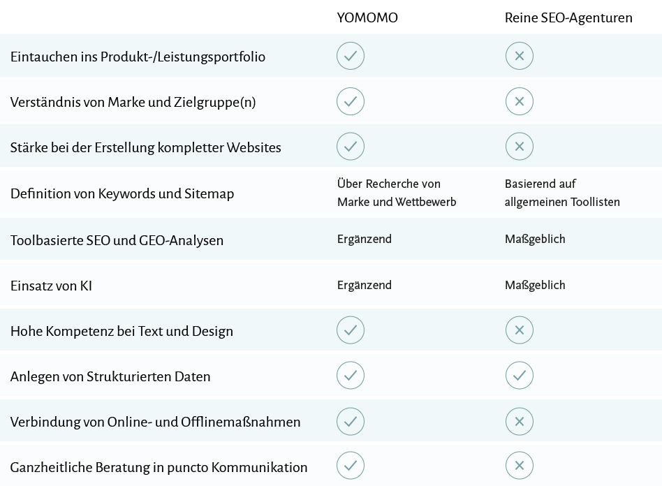 Trotz unserer SEO-Expertise legen wir Wert darauf, keine reine SEO-Werbeagentur zu sein. Das hat nichts damit zu tun, dass wir SEO-Agenturen die Existenzberechtigung absprechen. Im Gegenteil – wenn es um die Optimierung einer bestehenden Website geht, kann eine reine SEO-Agentur prima weiterhelfen. Wir glauben aber, dass eine neue Website unter SEO-Aspekten zu konzipieren mindestens so viel Wissen von Content und Kommunikation erfordert wie von Algorithmen.